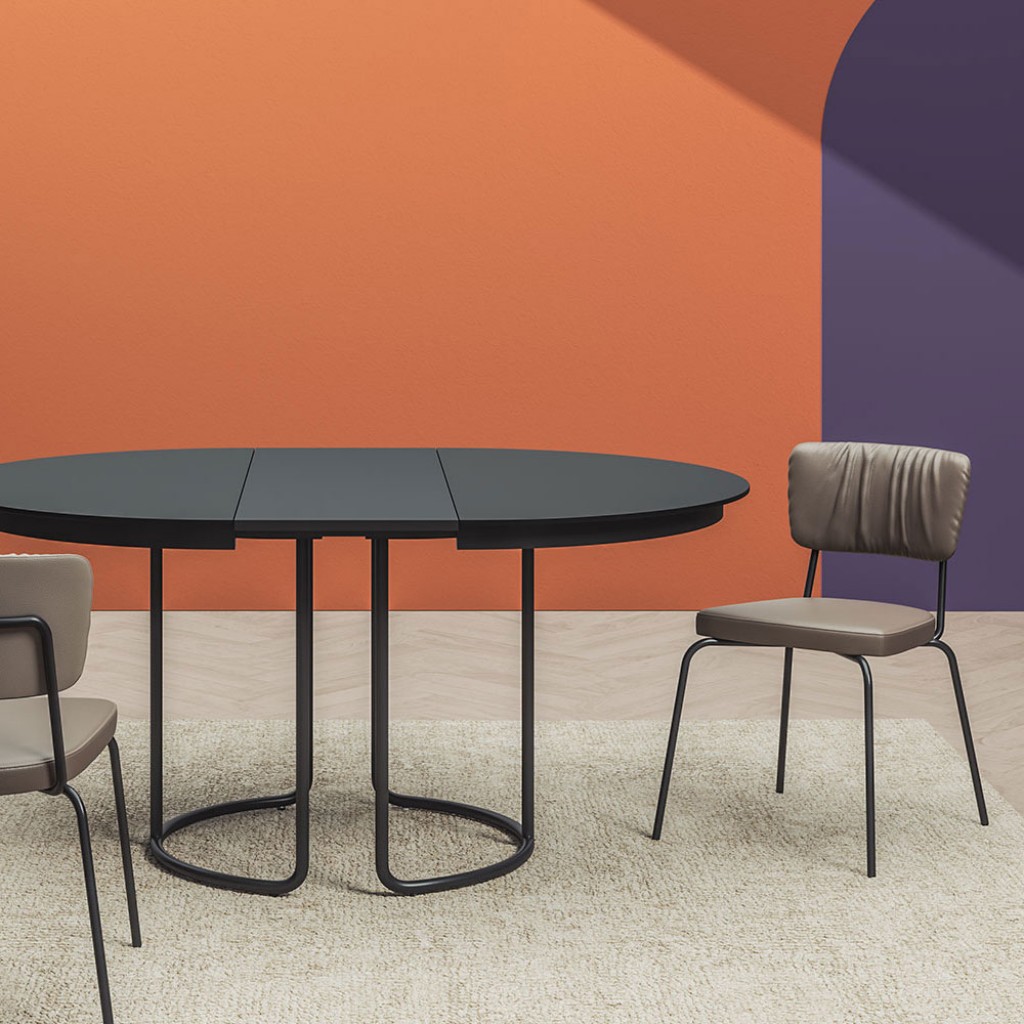Masa extensibila Puntoquadro se naste din forme geometrice simple si armonioase, caracterizate printr-un contrast original intre patrat si rotund. Liniile sunt impodobite cu accente cromatic.. -