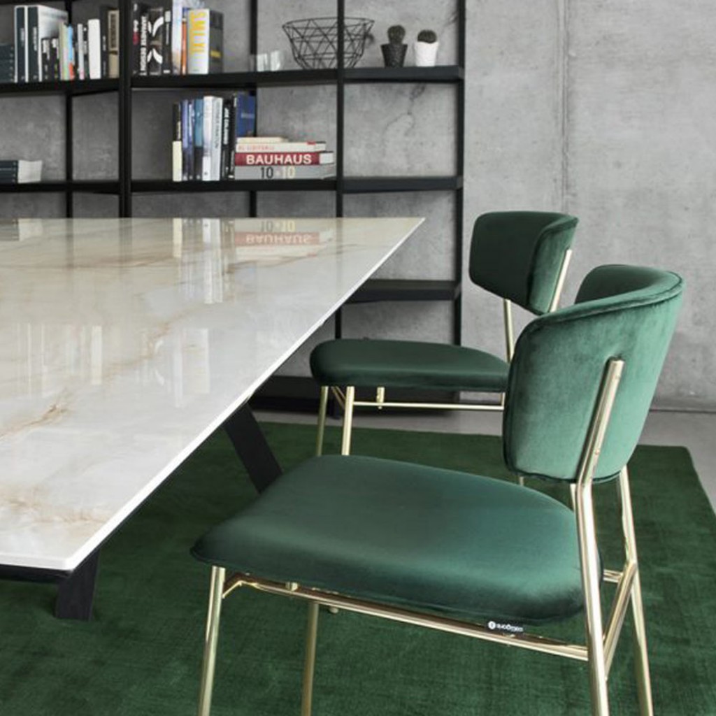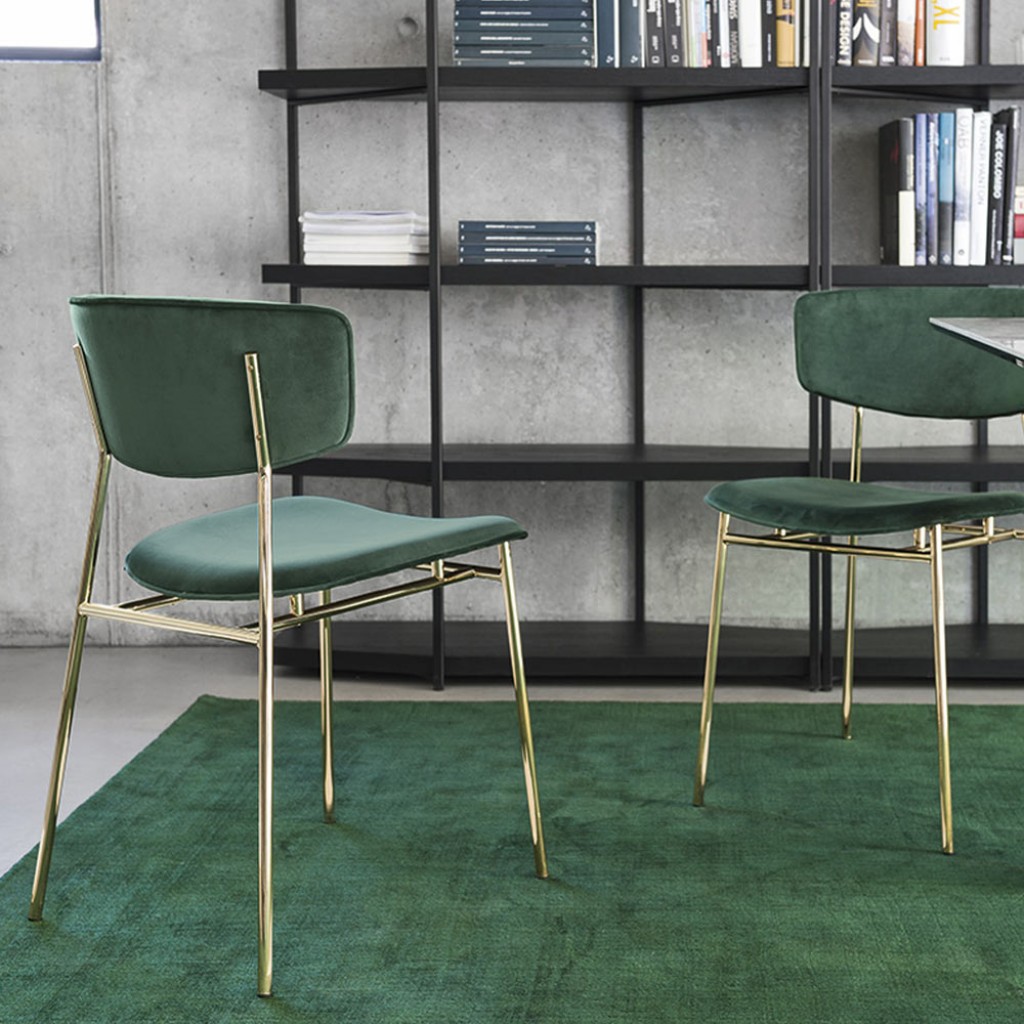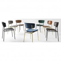 Fifties este un scaun ce reaminteste de stilul anilor '50, reinterpretat intr-o cheie moderna. Cadrul metalic din alama sau din metal negru se potriveste cu catifeaua de Venetia, pielea groasa sau pielea neagra Vintage, si denota un design extrem de rafinat.