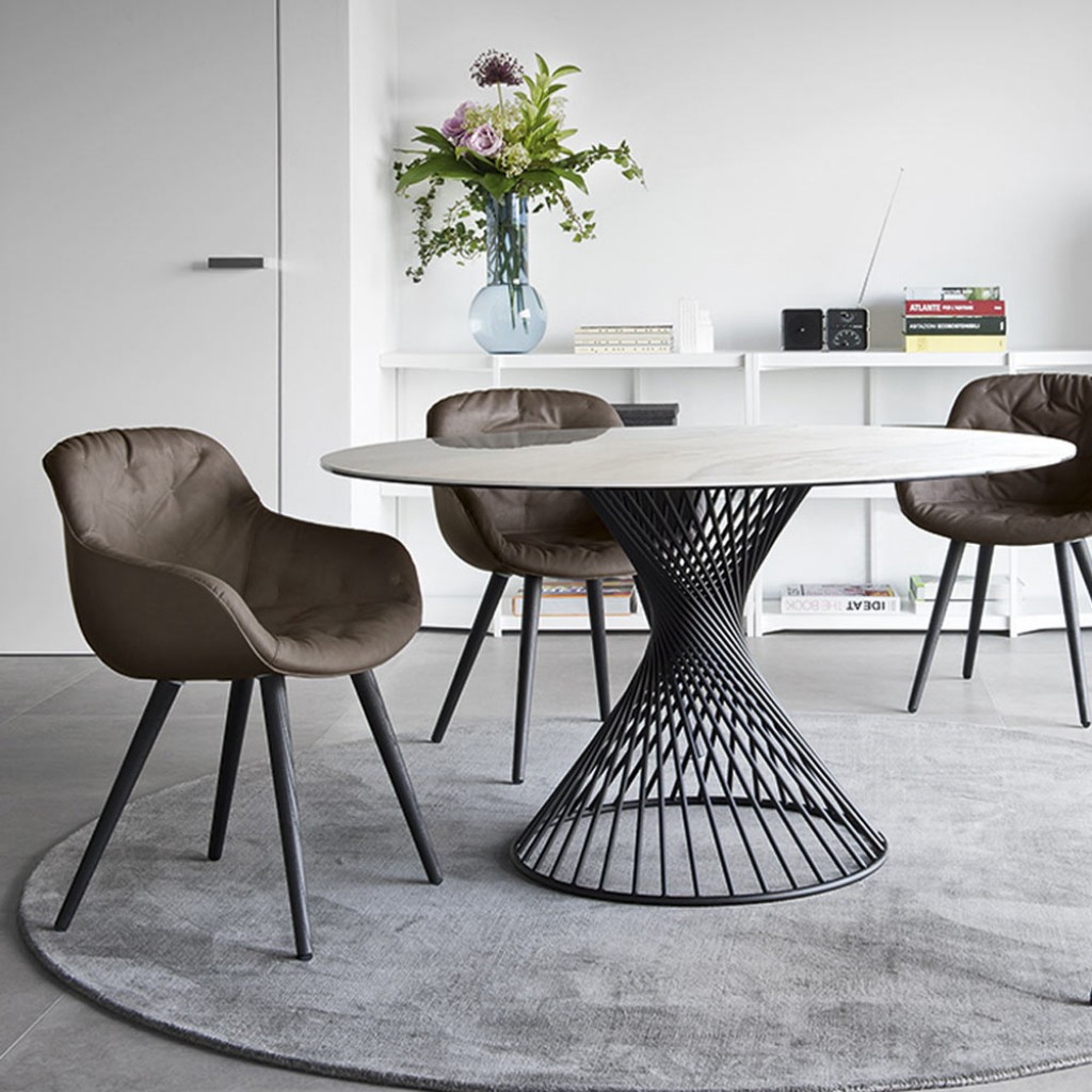 Masa Cartesio se mandreste cu linii iconice, elegante si cu un blat rotund din ceramica asezat pe un cadru original de sustinere a greutatii din metal compus din patru elemente dreptunghiula.. -