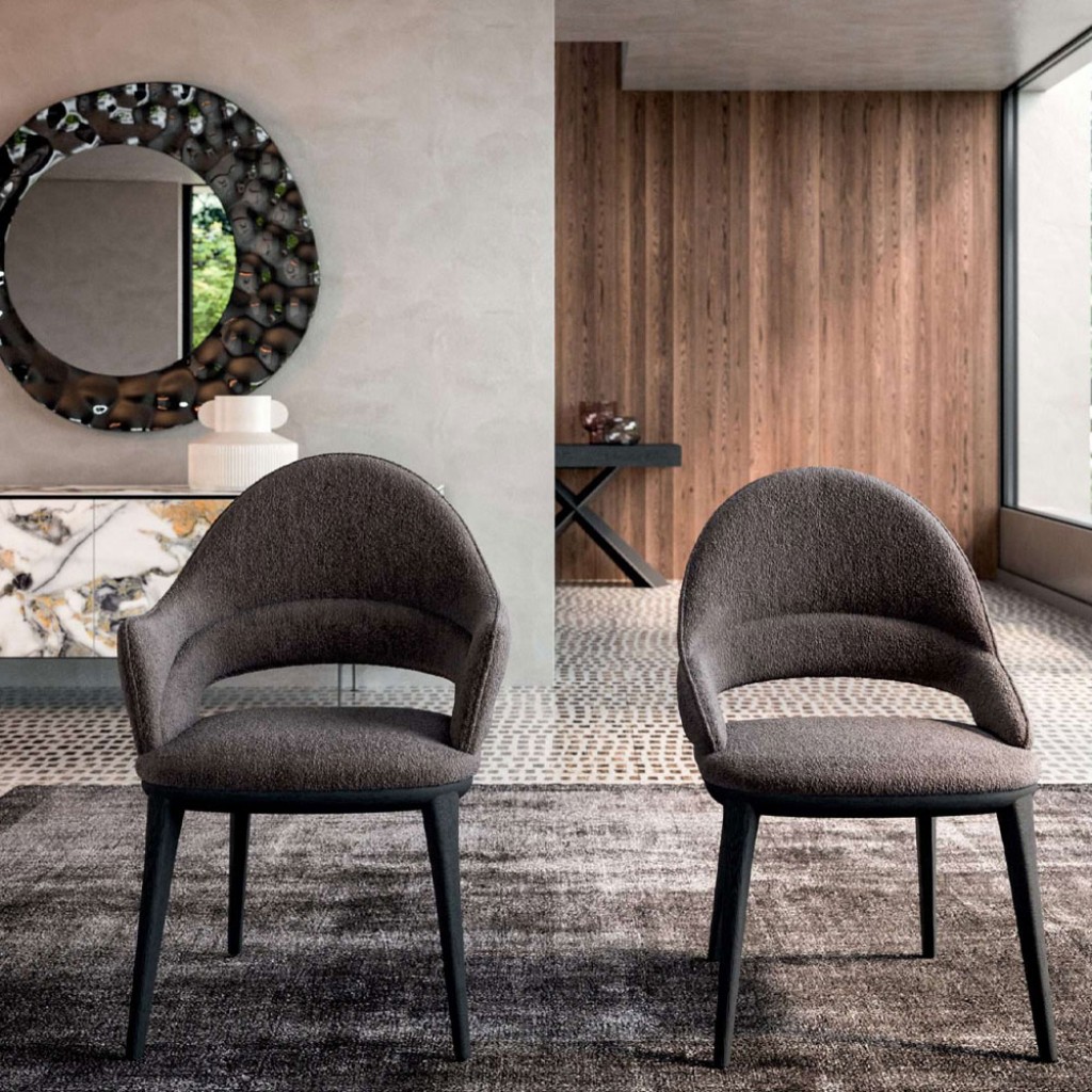 Liniile sinuoase si curbele interactioneaza intre ele, dand viata unei forme elegante de scoica, sustinuta de o structura solida de frasin. Baia este un cuib primitor in care sa te bucuri de senzatia placuta de a fi invaluit intr-o imbratisare linistitoare. Disponibil si in varianta cu cotiere, pentru un efect de cocon si mai accentuat. Scaun cu cotiere, spatar si sezut tapitat in diverse finisaje. Structura din frasin masiv periat si vopsit.