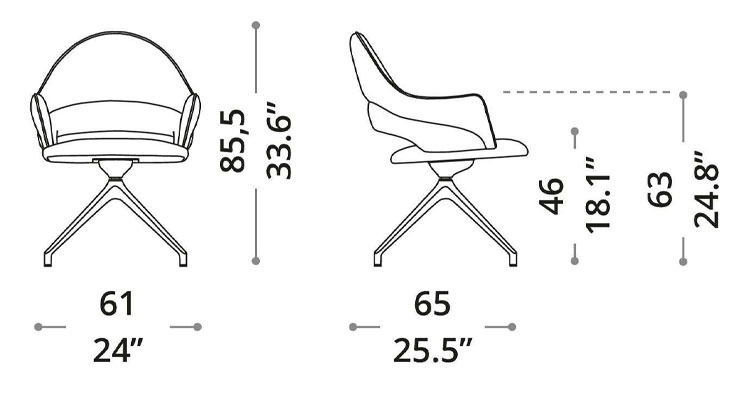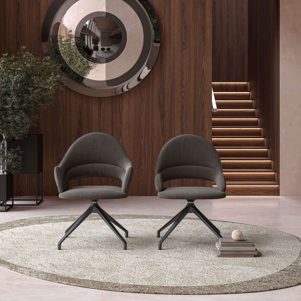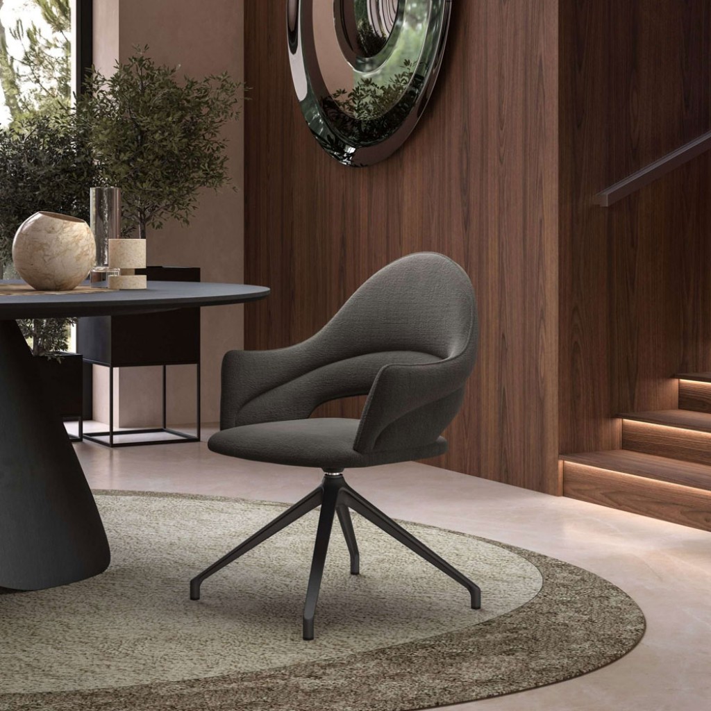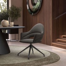 Un scaun elegant si versatil, cu spatar si sezut tapitate intr-o gama larga de finisaje, conceput pentru a oferi confort si stil in fiecare detaliu. Baza pivotanta, realizata din metal vopsit, adauga un plus de modernitate si functionalitate, permitand o libertate de miscare fluida si practica. Fiecare element este atent proiectat pentru a atinge echilibrul perfect intre design si confort, fiind ideal pentru orice ambient, de la cele dinamice la cele rafinate.