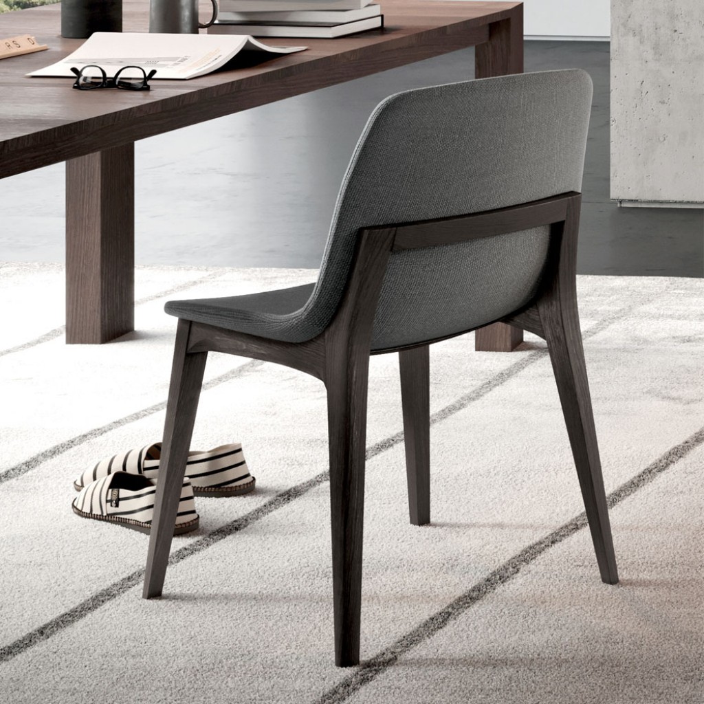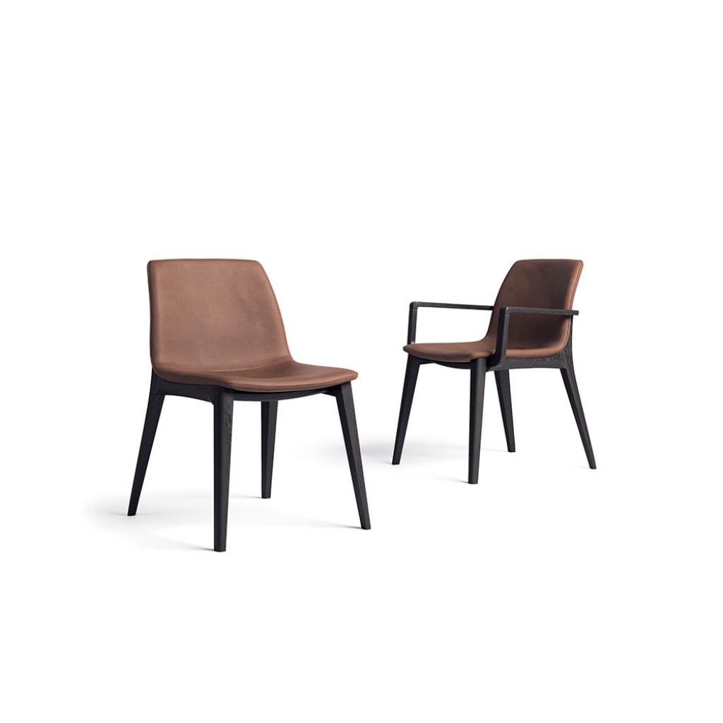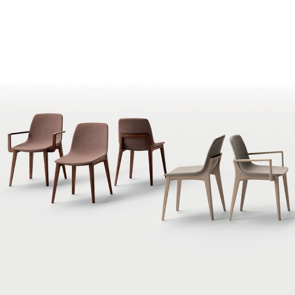 Scaun cu design modern din lemn de fag sau frasin. Sezut monobloc din placaj captusit cu spuma poliuretanica elastica, in diferite nuante.