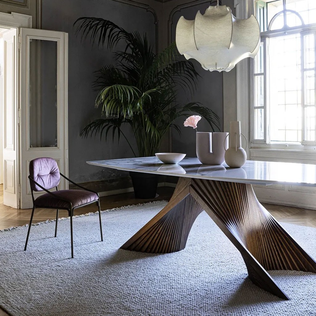 Thor, o masa de designer cu baza din metal lacuit si un amestec ingenios de elemente trunchiate concave si convexe, este disponibila si intr-o versiune extensibila pentru spatii mai mari, pu.. -