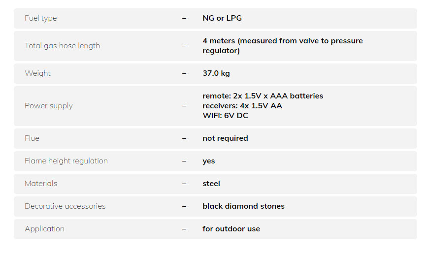 Galio Star Black este un semineu portabil de exterior intr-o carcasa neagra de 950 mm inaltime. Forma arzatorului seamana cu o stea cu sase colturi, ceea ce face flacara mai spatiala si mai spectaculoasa. Galio Star este o solutie sigura pentru a va extinde intalnirile de noapte, deoarece va permite sa va bucurati de o caldura placuta. Designul minimalist al carcasei negre se va potrivi perfect in gradina si va face din ea punctul central. Controlati-va semineul automat cu un panou de control sau o telecomanda.