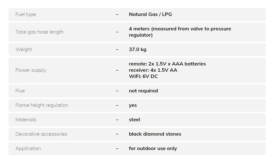 Galio Star Black este un semineu portabil de exterior intr-o carcasa neagra de 950 mm inaltime. Forma arzatorului seamana cu o stea cu sase colturi, ceea ce face flacara mai spatiala si mai .. -