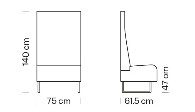 Sistem modular. Modul liniar L 75 cm. Sezut si spatar tapitate. Cadru din otel. Spatar H 140 cm. Accesorii: Inchidere spatar cu panou tapitat. Inchidere partea inferioara a cadrului cu panou laminat. Priza Schuko sau USB pe tapiteria scaunului fata