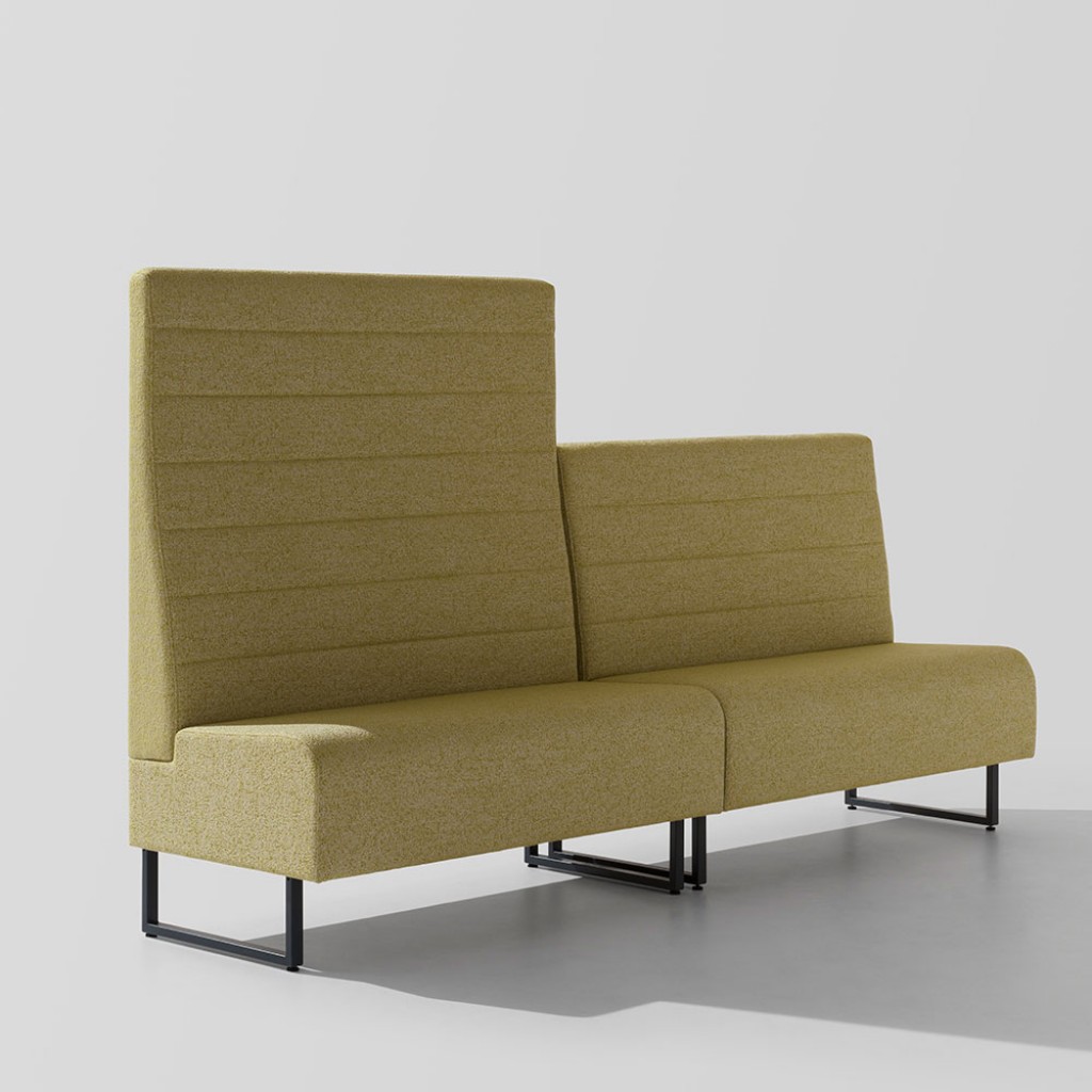 Sistem modular. Modul liniar L 90 cm. Sezut si spatar tapitate. Cadru din otel. Spatar H 100 cm. Accesorii: Inchidere spatar cu panou tapitat. Inchidere partea inferioara a cadrului cu panou.. -