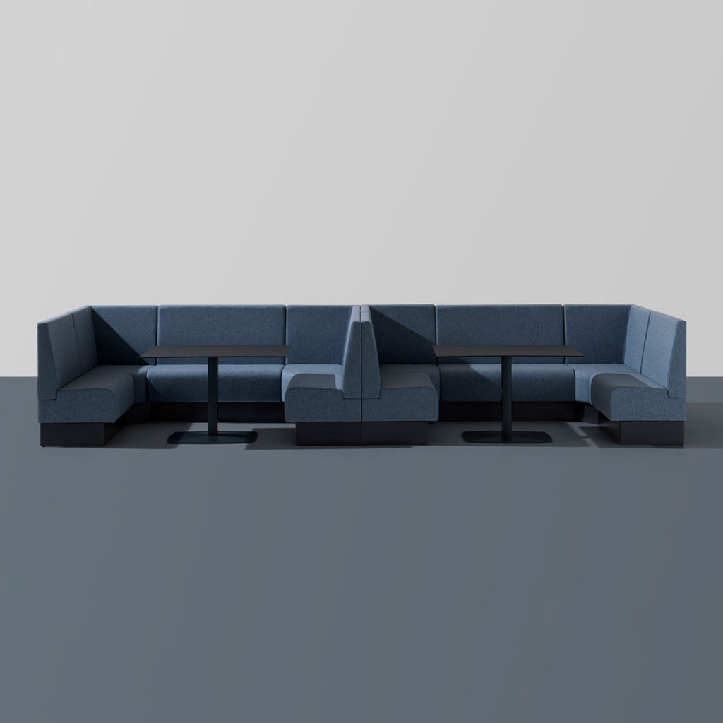 Sistem modular. Modul de colt. Sezut si spatar tapitate. Cadru din otel. Inaltimea spatarului 100 cm. Accesorii: Inchidere spatar cu panou tapitat. Inchidere partea inferioara a cadrului cu panou laminat. Priza Schuko sau USB pe tapiteria scaunului fata