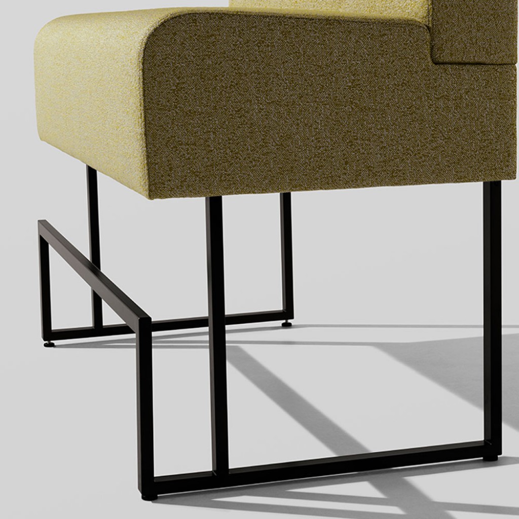 Sistem modular. Modul de colt. Sezut si spatar tapitate. Cadru din otel. Spatar H 140 cm. Accesorii: Inchidere spatar cu panou tapitat. Inchidere partea inferioara a cadrului cu panou lamina.. -