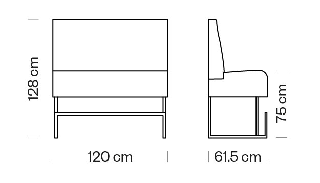 Sistem modular. Modul liniar L 120 cm. Sezut si spatar tapitate. Cadru din otel. Spatar H 100 cm. Accesorii: Inchidere spatar cu panou tapitat. Inchidere partea inferioara a cadrului cu pano.. -