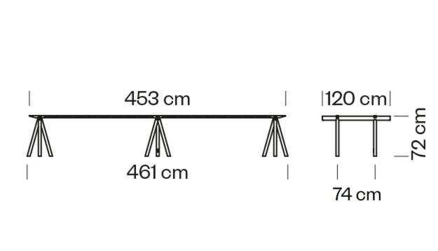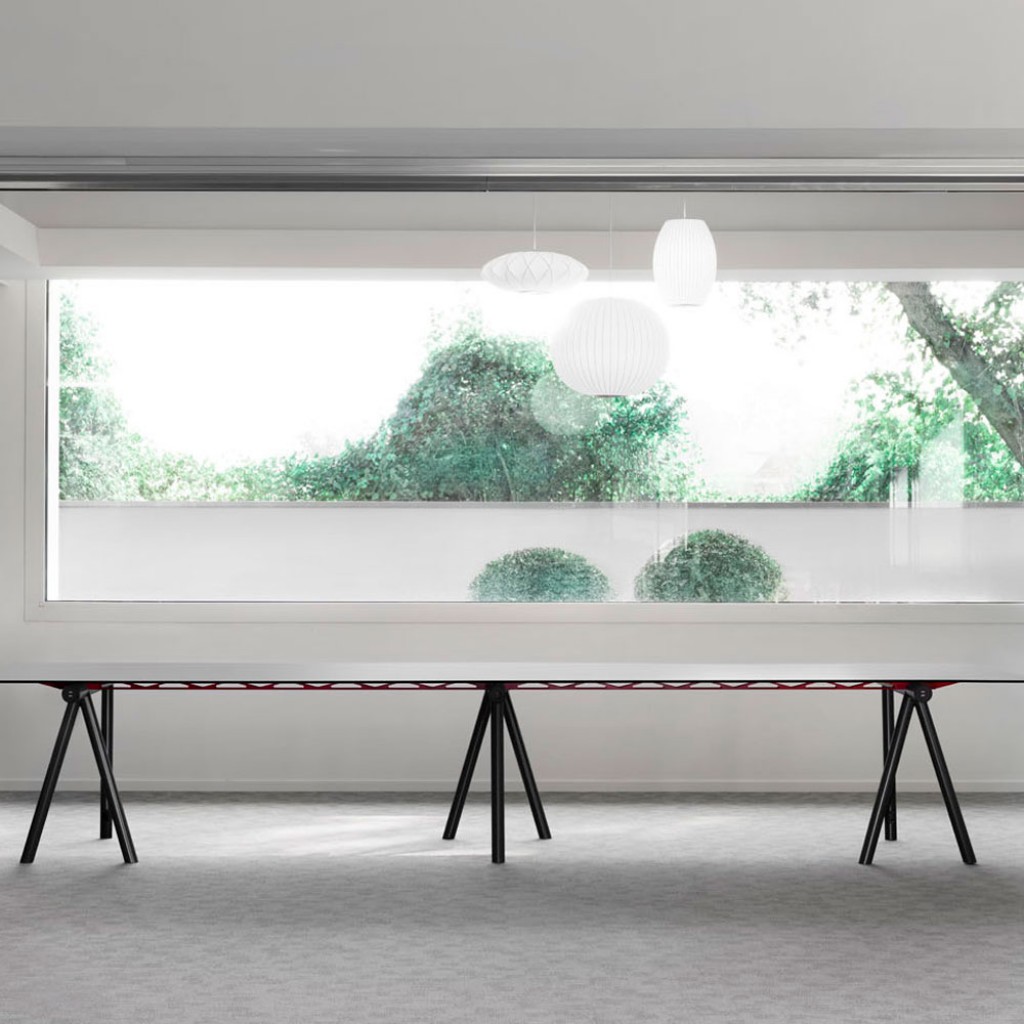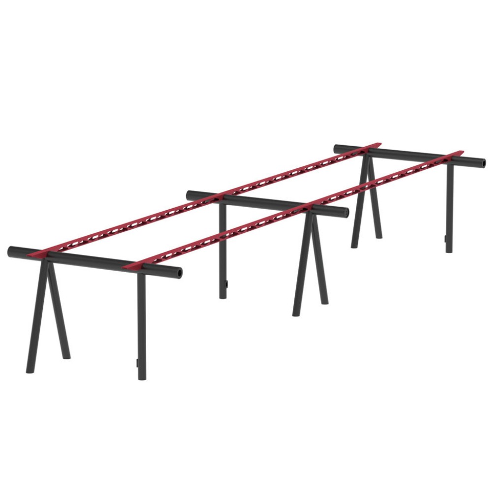 3 sevalete din tuburi de otel. Versiune cu traverse din otel taiate cu laser, lungime totala 453 cm. Fiecare sevalet este echipat cu 1 priza schuko si 2 prize USB.