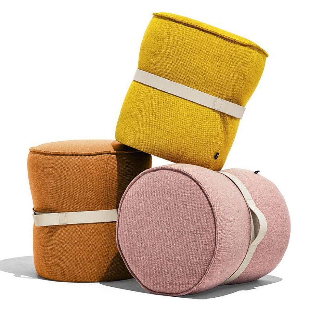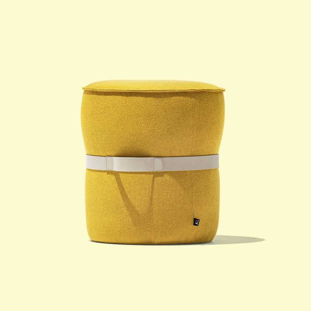 Pof este un taburet rotund, complet captusit. Are cusaturi pe toata marginea taburetului si banda decorativa cu maner de cauciuc.
