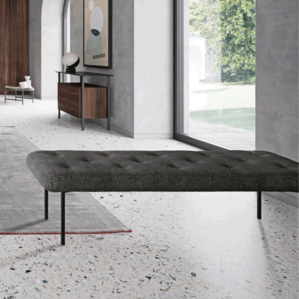 Stelo este o bancheta capitonne cu picioare metalice si un sezut in doua lungimi. Poate fi tapitat cu material textil, piele sau piele ecologica.