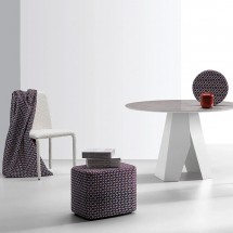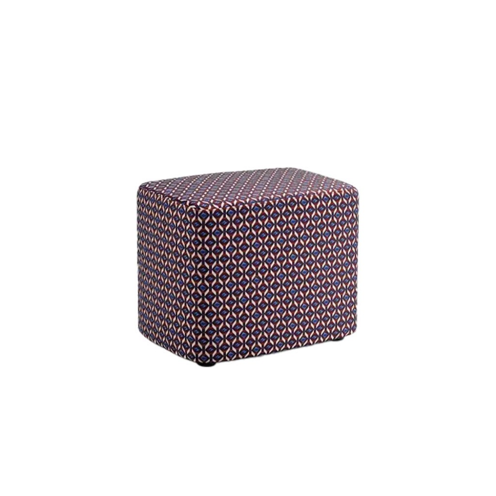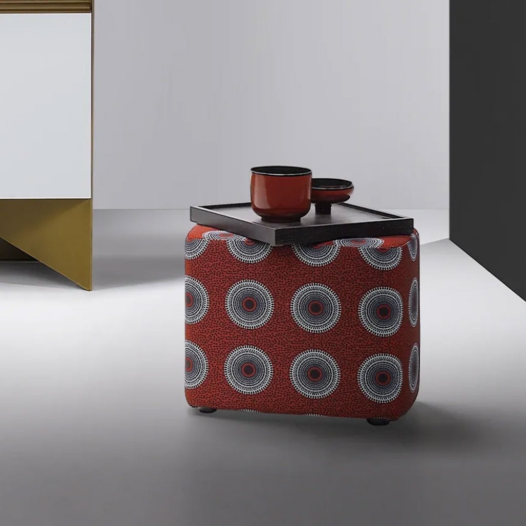 Acest taburet de designer are o forma plina si primitoare si este tapitat in tesaturi cu modele inspirate din stilul etnic. Perfect ca loc de sedere informal sau ca masuta confortabila in centrul unui spatiu interior, atat acasa, cat si in domeniul ospitalitatii.