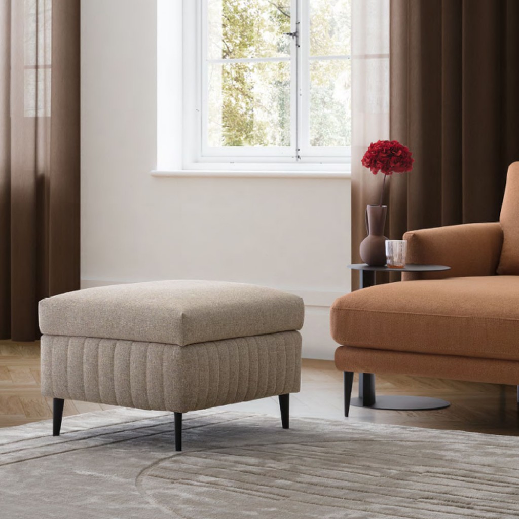 Volume soft pe un cadran metalic elegant, cu patru picioare rafinate si subtiri. Eline este un taburet dreptunghiular care aduce inovatie in camera de zi, actioneaza ca un scaun sau ca o mas.. -