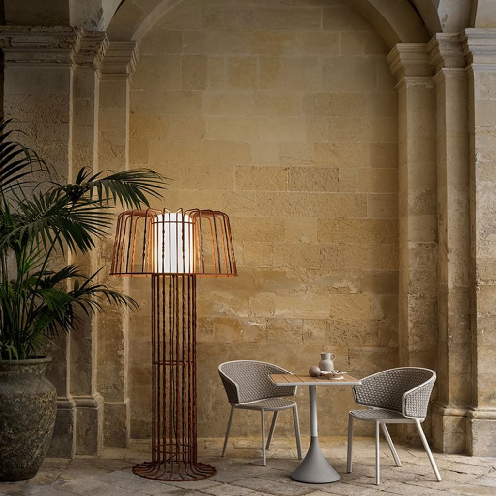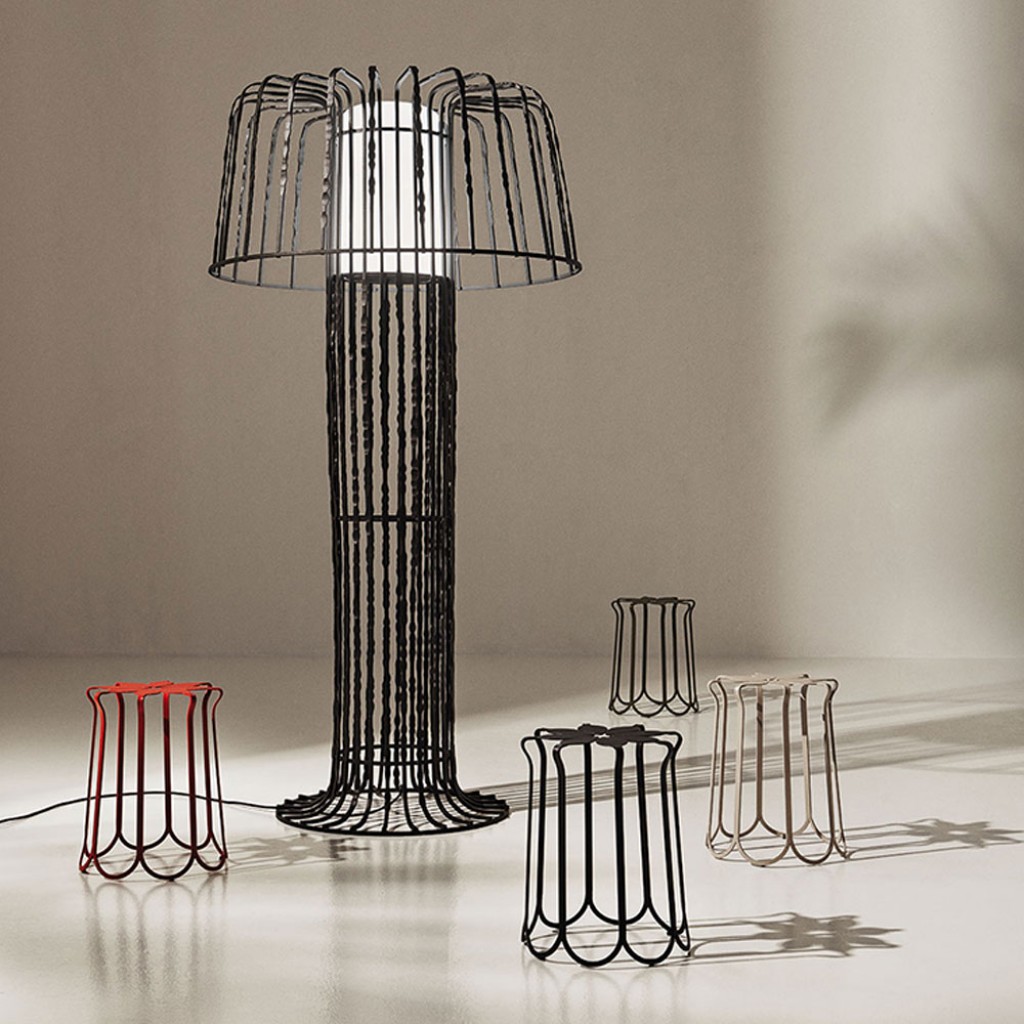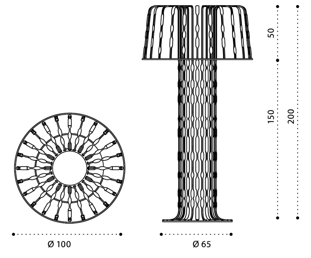 Lustra este o lampa de podea cu o prezenta teatrala puternica si o eleganta innascuta care se ridica la o inaltime de doi metri, cu un diametru de un metru si un capac din sticla suflata. Lustra ofera caracter spatiilor exterioare, un amestec de know-how traditional si design contemporan.